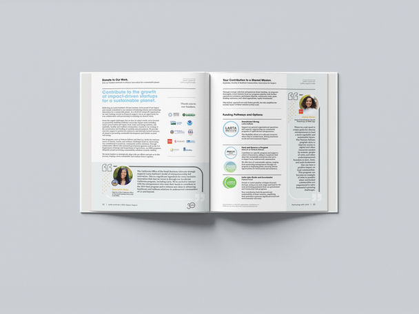 The 2023 Impact Report was crafted around Larta’s new focus areas: nature preservation, food, water, and energy systems, and building equitable, healthy, and resilient communities. These themes were brought to life through an interconnected circle design, symbolizing Larta’s pivotal role in advancing its 'Sustainable Planet Thesis: Our Impact, Investment, and Portfolio Strategy.' The layout is clean and modern, with bold, vibrant colors that create visual contrast and energize the page. This dynamic design not only showcases the interlocking themes but also reinforces Larta's commitment to driving sustainable, impactful change across all its initiatives.