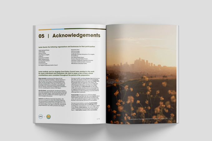 The initial "Rooted Horizons" report was a rapid-turnaround project, moving from concept to completion in under two months. While a collaborative team of experts was still drafting the content, I collected assets and designed the entire layout simultaneously, ensuring everything came together seamlessly. The design features a clean and striking layout that balances readability with visual appeal, tying together photos, colors, and fonts to create a cohesive and engaging report. The result was a polished publication available both online and in print, highlighting Larta's commitment to advancing urban agriculture in Los Angeles County.